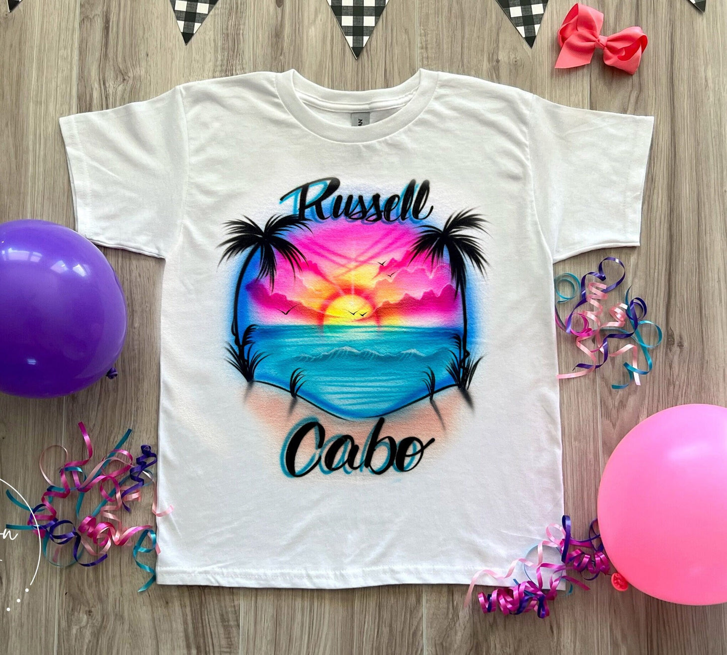 Our Airbrush Vacation T Shirt is a great gift to have when you go on vacation this year. We can do any location. We can change the colors to your liking or take away or add elements if you would like.