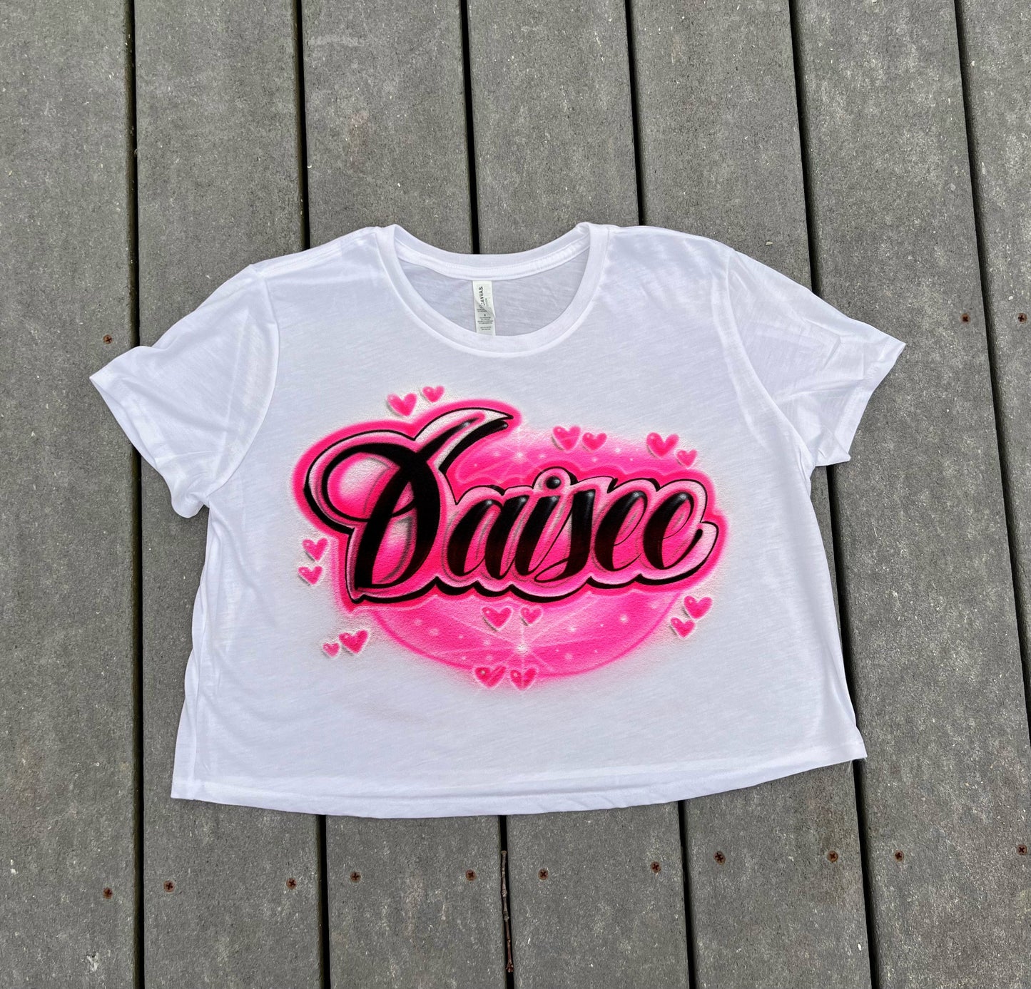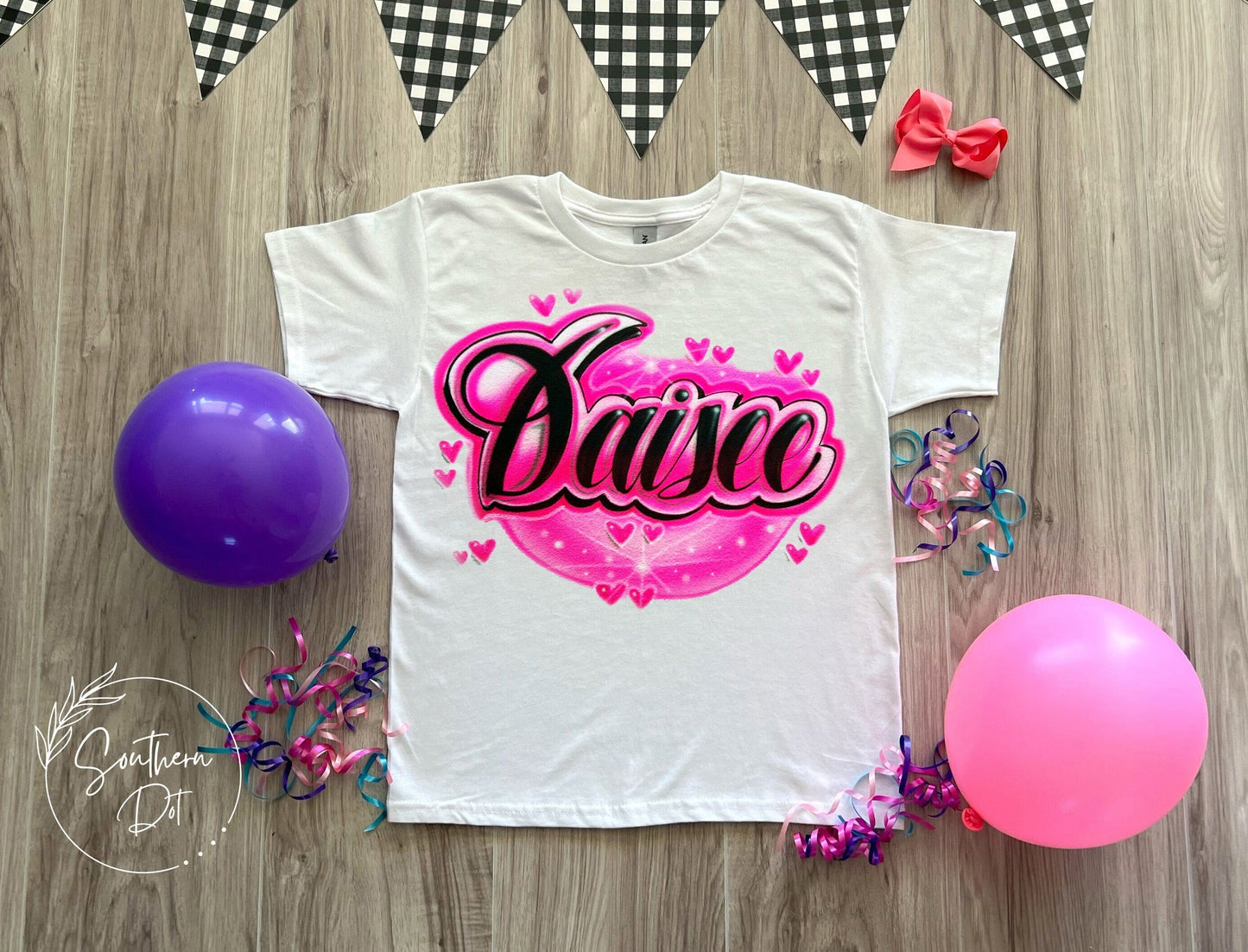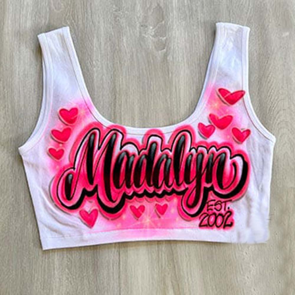 Our Airbrush Shirt features a cute script name design outlined with hearts and a pretty color filled center. We offer this design in many different colors and your choice of name or text. Our airbrush t shirts are one of a kind and are part of many of the airbrush apparel we offer in our store.