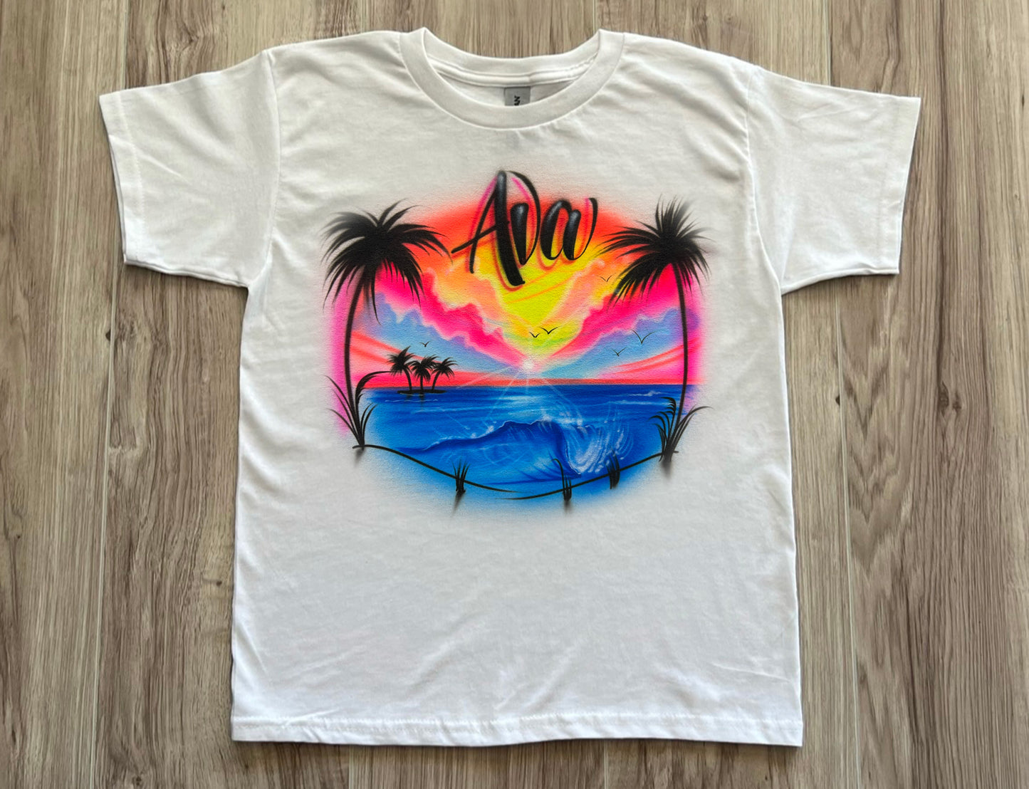 Our Airbrush Vacation T Shirt is a great gift to have when you go on vacation this year. We can do any location. We can change the colors to your liking or take away or add elements if you would like.